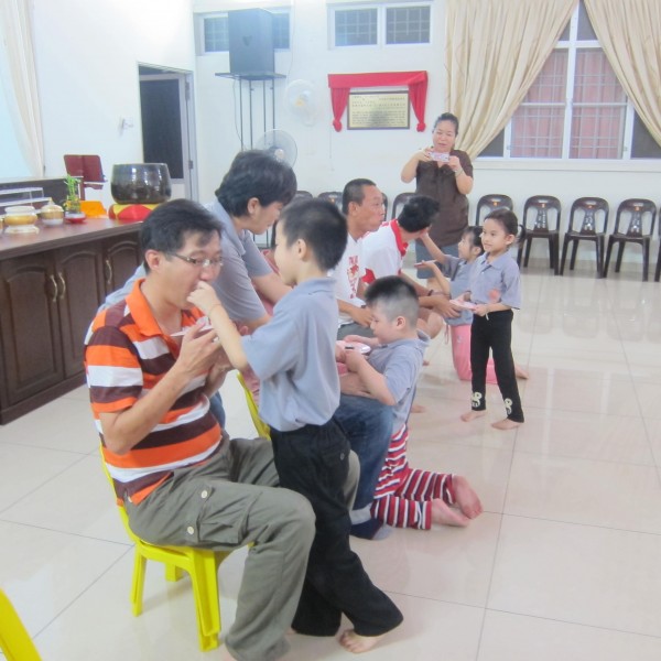 在分组后,孩子们各自设计组别图案及念口号,而后在何老师的带领下享用午餐,并学习念供养偈及结斋偈。午餐后,为了表达对父母的恩情,老师带领学生用纸条、木枝、彩色珠子串成一条爱心手链送给父母。