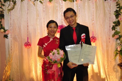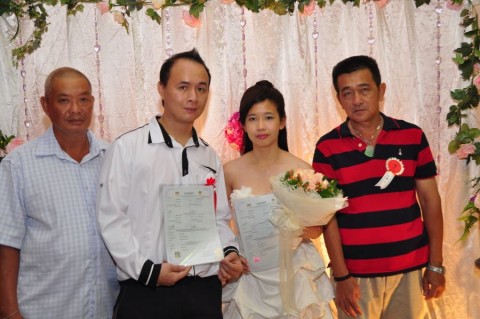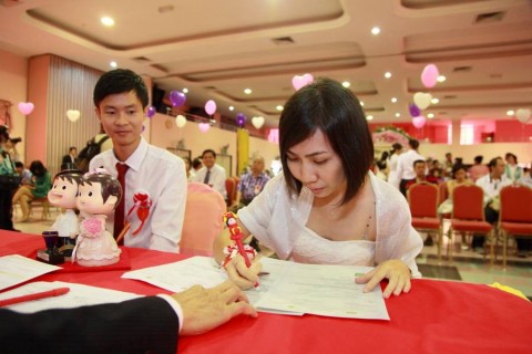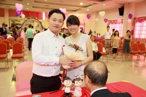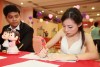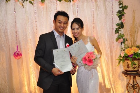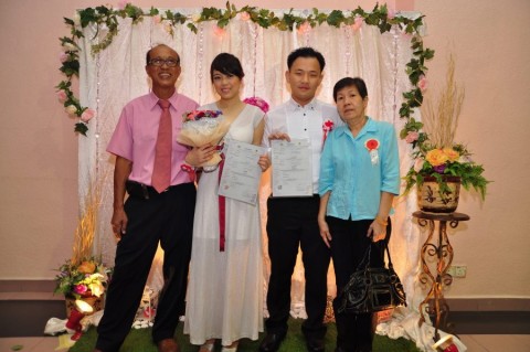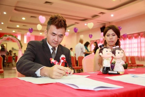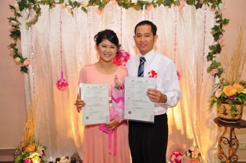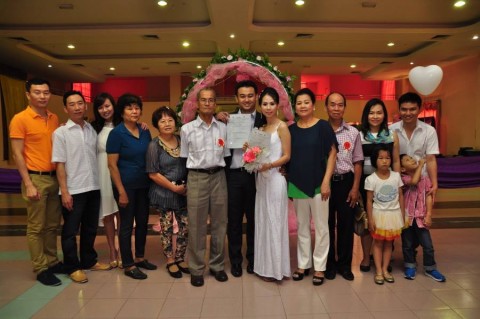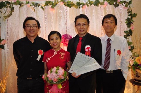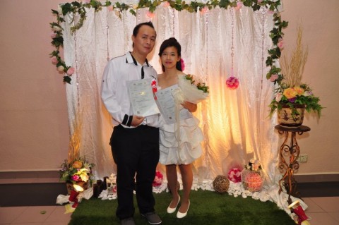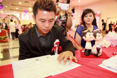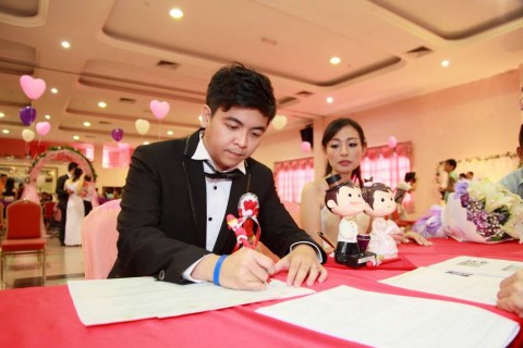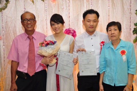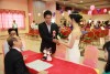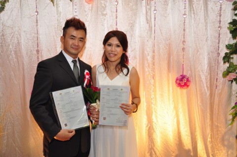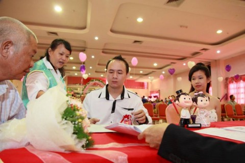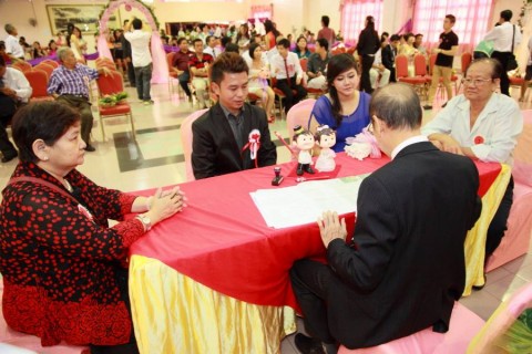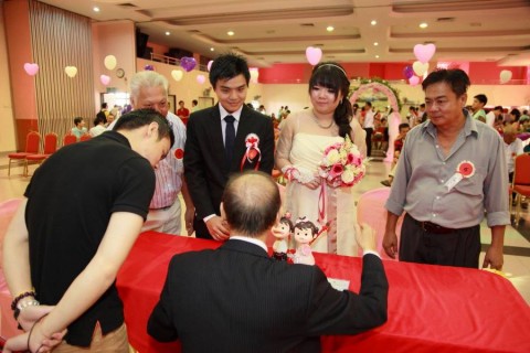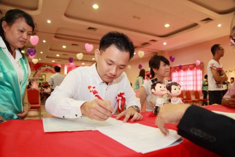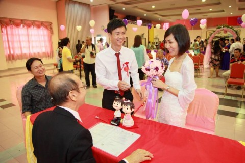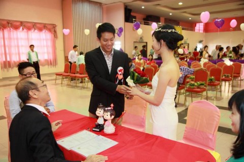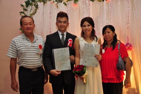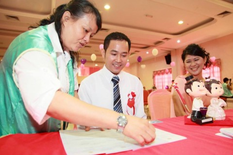 婚姻注册官助理陈炳根先生在五楼礼堂为13对新人主持婚姻注册。