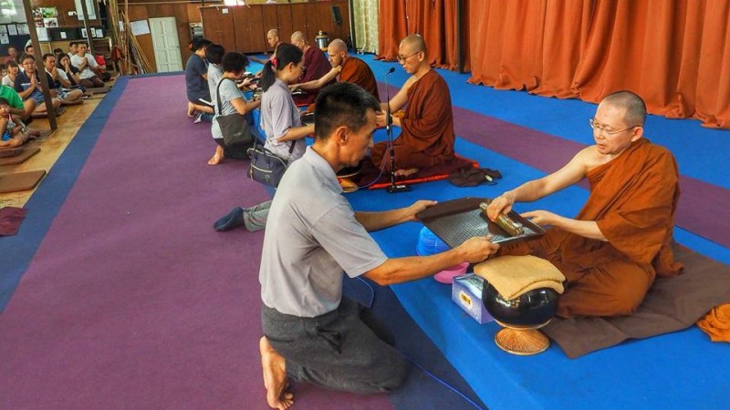 11点15分,大家就开始下山回大殿参与供僧仪式。大殿坐满了信众。有些信徒布施袈裟、雨伞等物品。回向功德后,大家就到食堂排队拿食物。用完午斋后,大家就各自启程回家了。