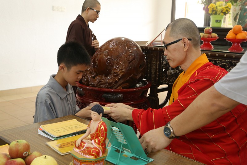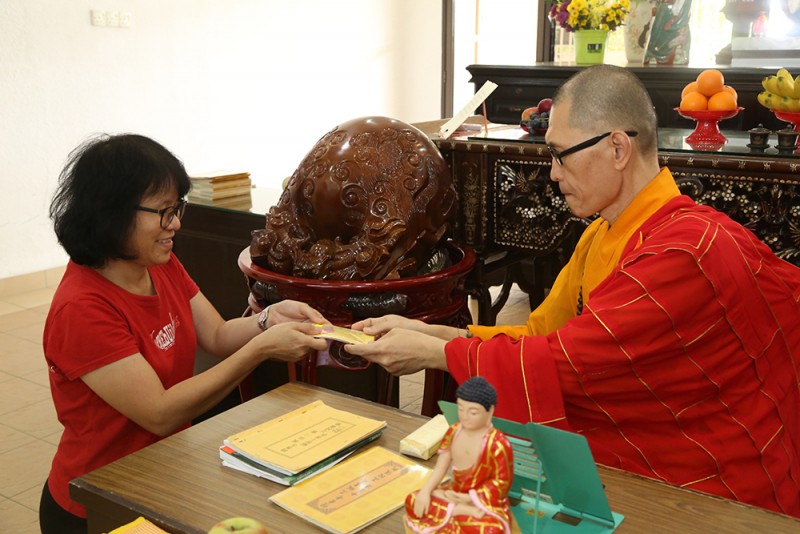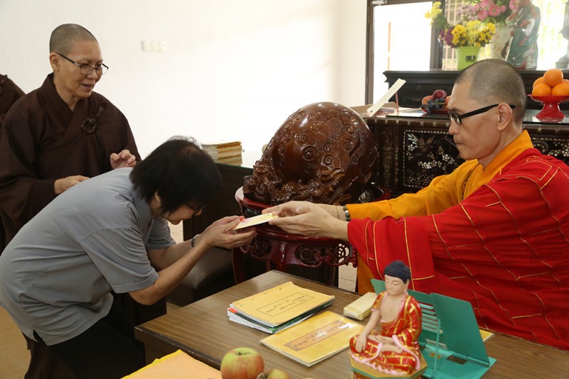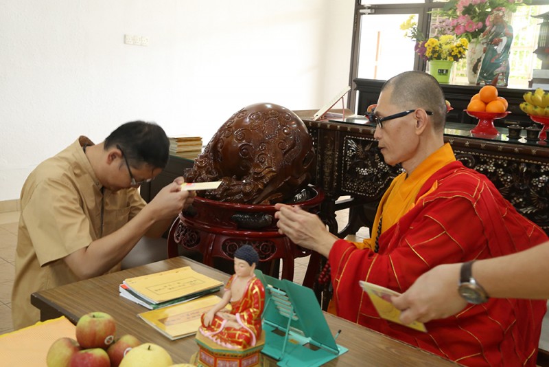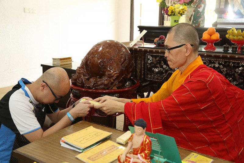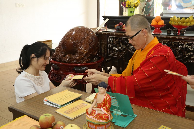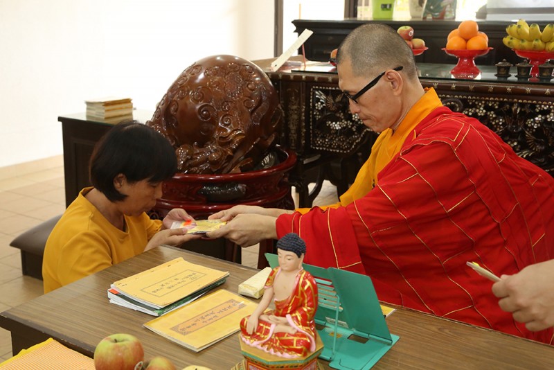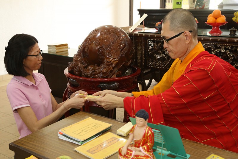 该三皈五戒传授仪式於3月25日在峇六拜檀香寺底楼大悲殿举办,从下午2时至3时半的一句半钟完成。