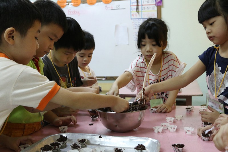 在手工环节中,孩童们学习穿手链,设计环保袋,还有学习制作简单的饼干,并将这些手工、饼干在亲子交流会时亲自送给父母以示感恩。