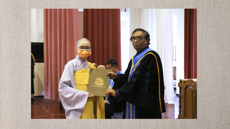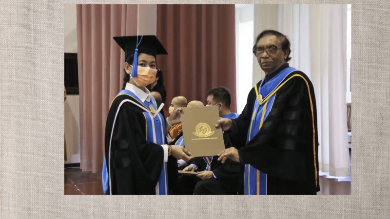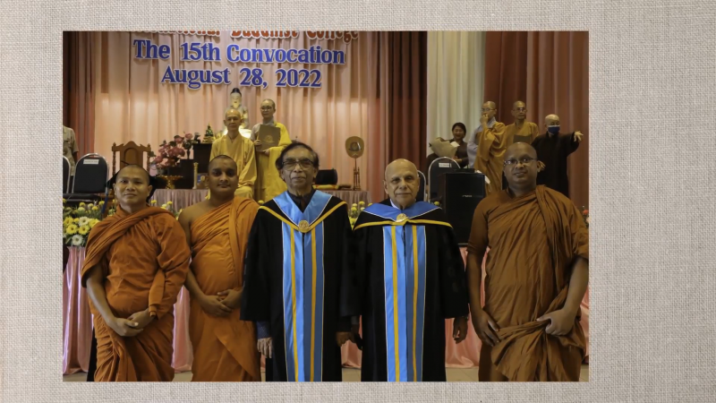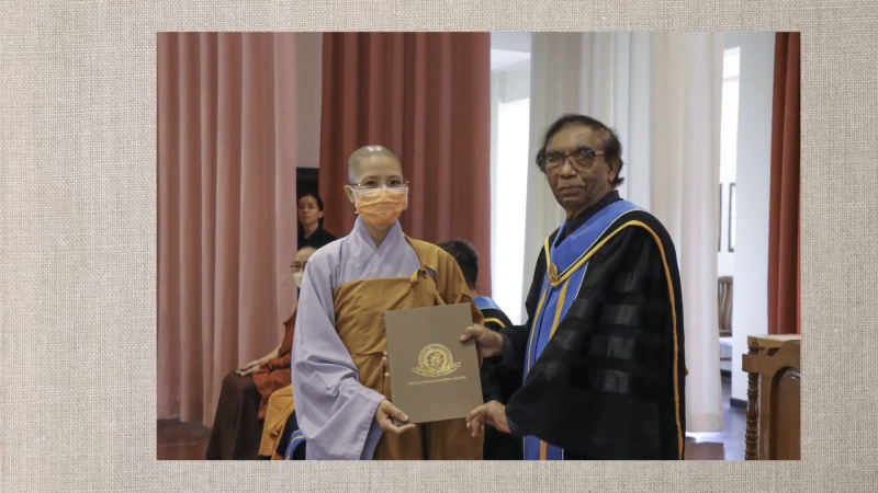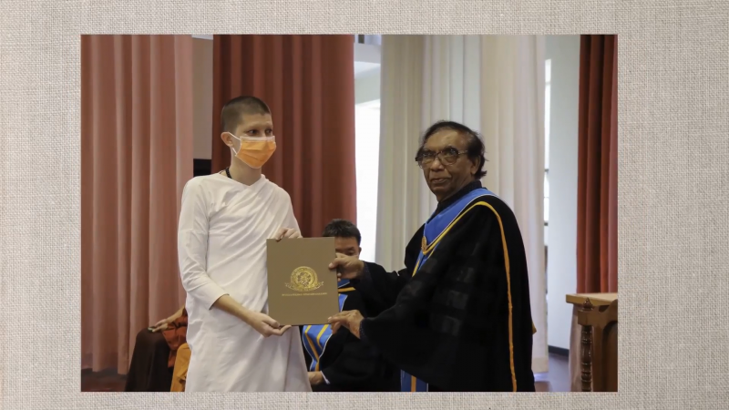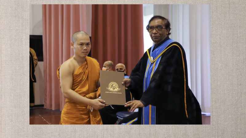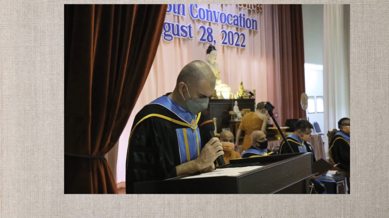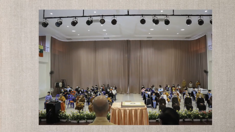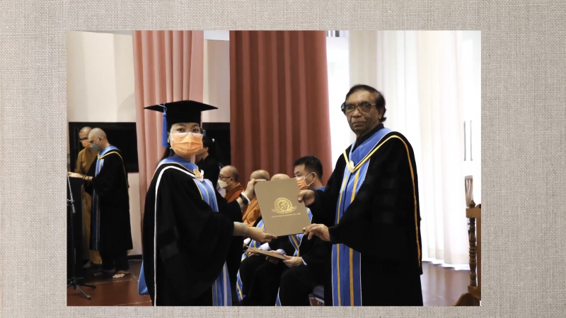 仪式开始首先是董事会主席唯悟法师致词。接着是由副校长Kapila 教授致词。Mattia 副教授颁发硕士毕业文凭、法庆博士颁发学士毕业文凭。恭喜Bakulchakma 居士及祁锋法师获得品学兼优学生奖,由唯悟法师颁发奖项。