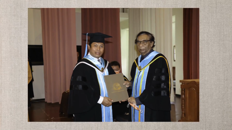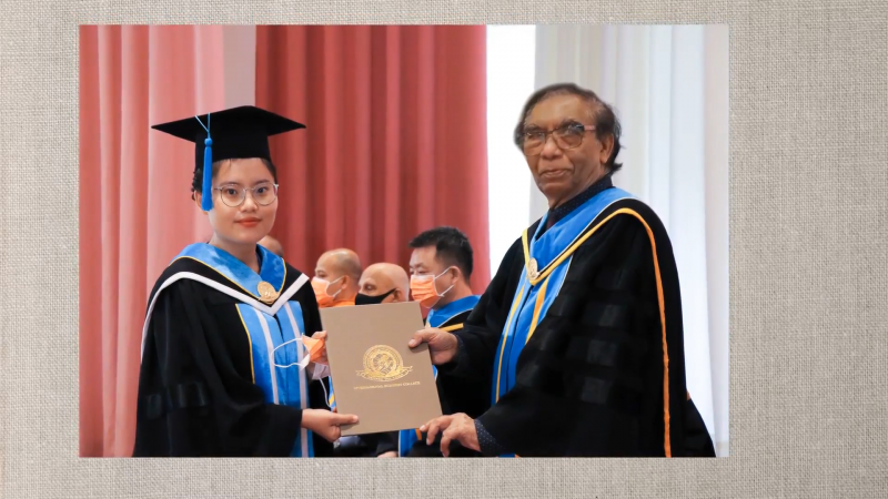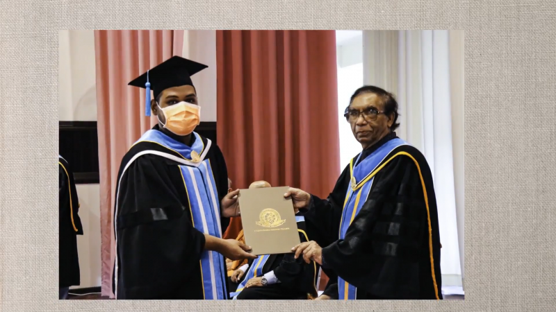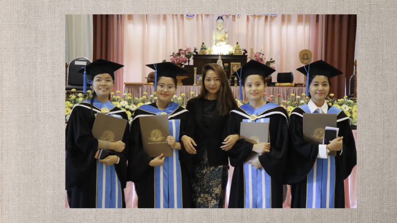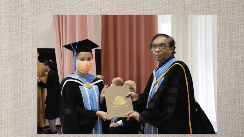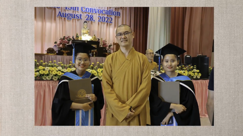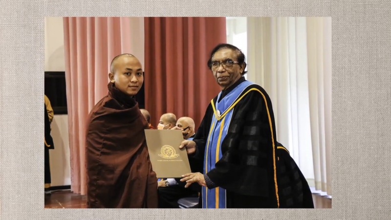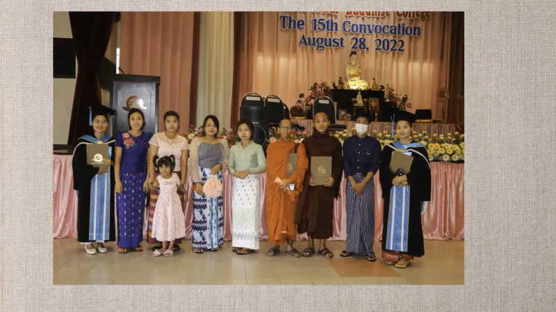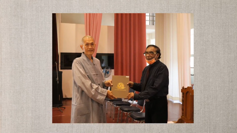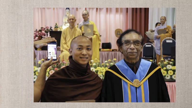 仪式开始首先是董事会主席唯悟法师致词。接着是由副校长Kapila 教授致词。Mattia 副教授颁发硕士毕业文凭、法庆博士颁发学士毕业文凭。恭喜Bakulchakma 居士及祁锋法师获得品学兼优学生奖,由唯悟法师颁发奖项。