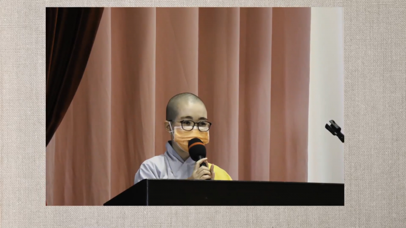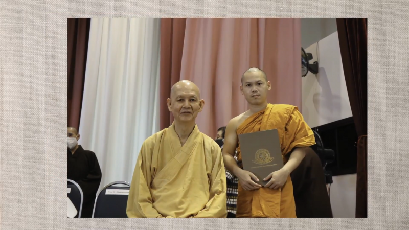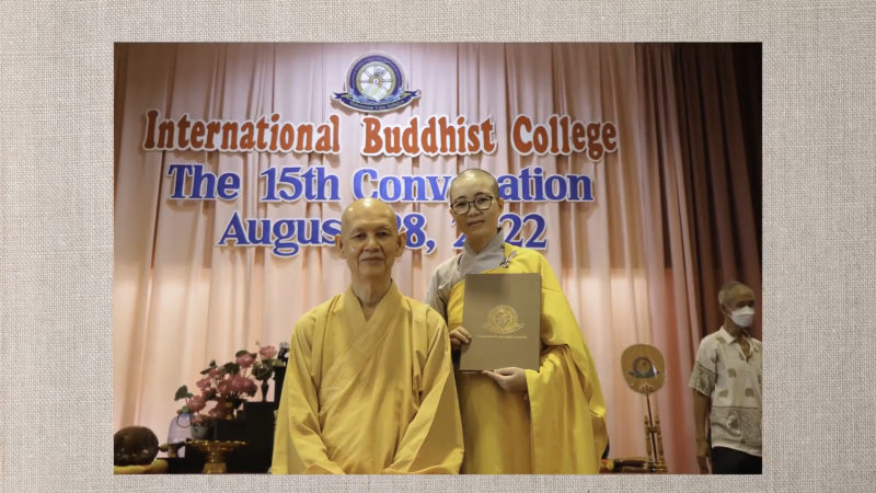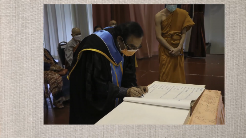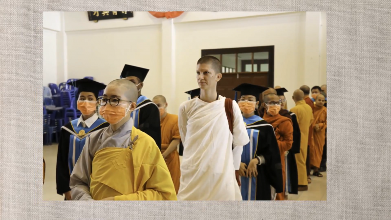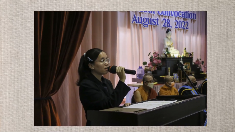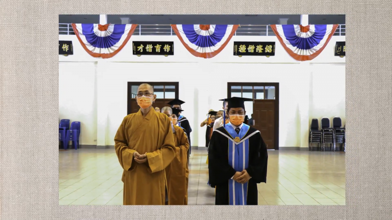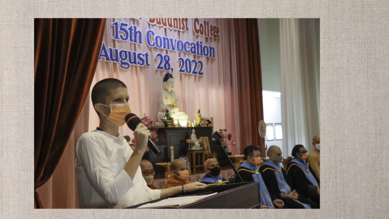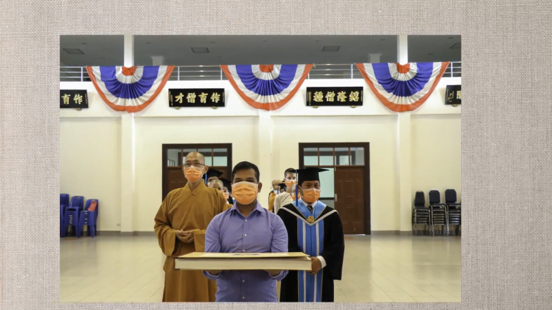 紧接是毕业生代表致谢词,英文致谢词由Machee Dakkhina法师代表毕业生,而华文致谢词由清欣法师代表毕业生。接着, 恭请副校长签毕业生名册。