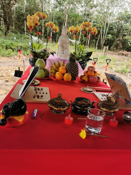 法師說,祥雲淨苑動土禮,是殊勝之日,旨在尊重這片土地的原有眾生,山神地神,與他們打個交道,並請他們作為護法。