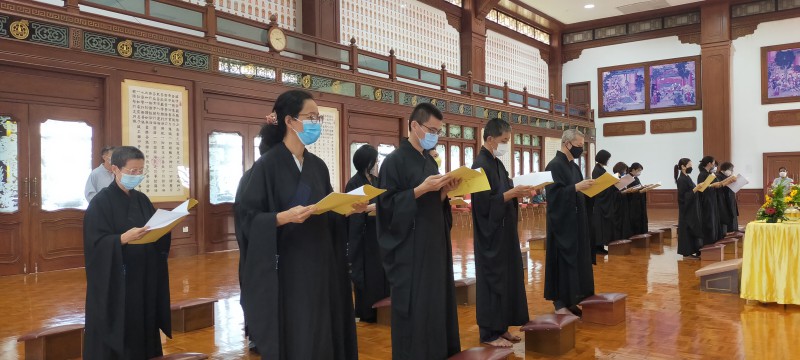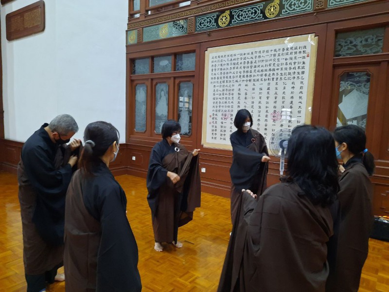 檀香寺开山上唯下悟法师为成员们传授十善戒法,并正式宣告成立本寺的「在家僧团」。