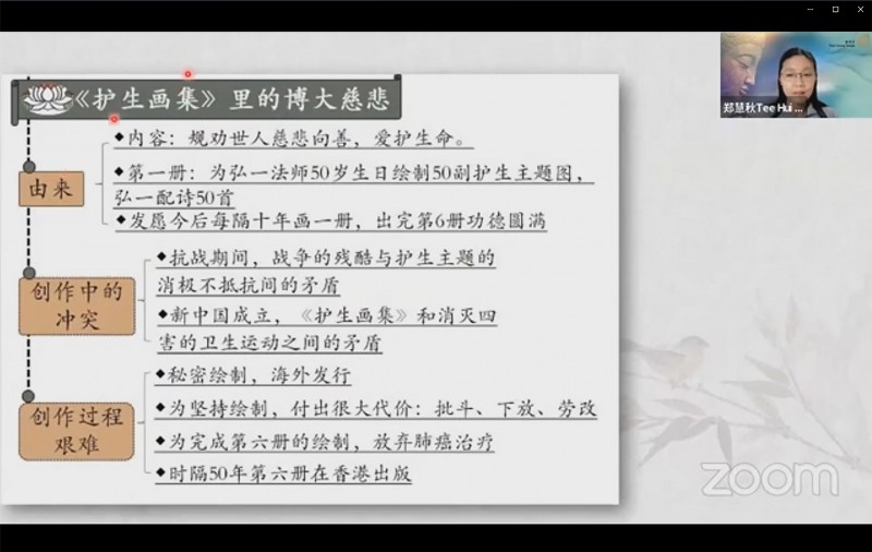 Submitted by meijun on Thu, 09/02/2023 - 17:11 檀香普门品在线共修 槟城檀香周日佛学班老师郑慧秋居士分享「“漫”赏《护生画集》」 郑慧秋居士是槟城檀香周日佛学班老师,也是檀香寺在家僧团成员。 郑慧秋居士介绍《护生画集》由丰子恺绘画、弘一法师等撰文题字,内容以护生为主题,主要规劝世人慈悲向善,爱护生命,历时46个年头始完成。 更多精彩内容请观赏https://www.youtube.com/watch?v=FPNBwsCuAyo 活动报导 Log in to post comments2872 reads