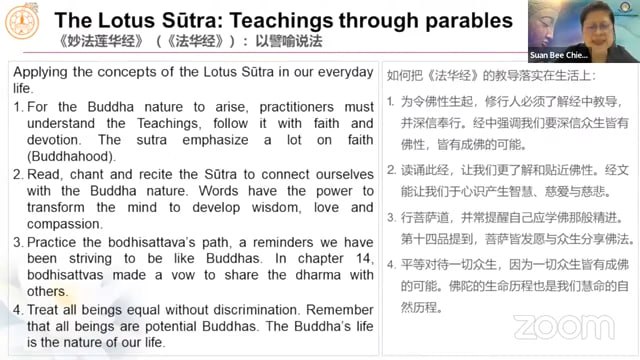 提到如何把《法华经》的教导落实在生活上,周碹美居士强调要行菩萨道,与众生分享佛法,以及要平等对待一切众生,因为佛陀的生命历程也是我们慧命的自然历程。