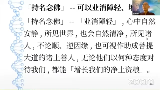 真如法师开示大众:「持名念佛」可以业消障轻,增长我们的净土资粮,而「老實念佛」则能使你左右逢源、得道者多助,纵然遭遇横逆,也能逢凶化吉。真如法师勉励大众把自己所有的执着心和自私心渐渐放下而专心一意念佛,感受和观念自然会改变;若能修持阿弥陀佛的念佛法门,阿弥陀佛会给我们平安、勇气、毅力、健康、幸福、欢喜、快乐与清净,只要持名称念阿弥陀佛的圣号自然便会心开意解,心胸豁达!