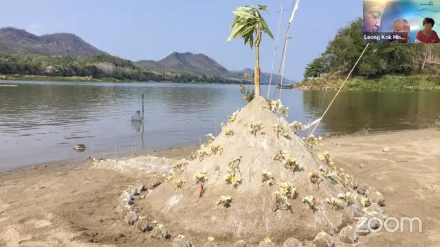 沿着湄公河的沙滩会看到好像金字塔的沙堆,代表着佛教的须弥山,寮国人喜欢在新年或者佛诞节的时候建造,沙堆顶部插了很多旗帜或钞票等,之后会拿去供养寺庙。