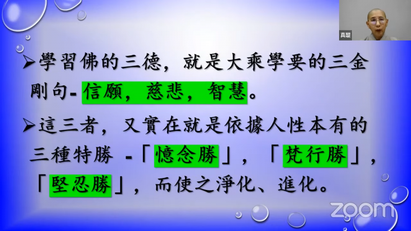 学习佛的「三德」,就是大乘学要的三金刚句,那就是:「信愿﹑慈悲﹑智慧」。