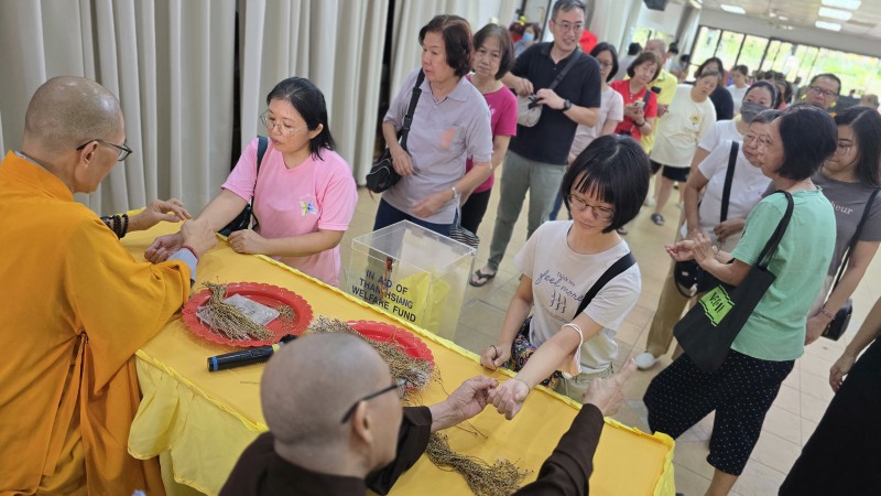农历四月十五日是佛陀日,檀香寺举行了盛大的庆典活动。楼下大悲殿从早上八点半至下午一点半,设有僧伽祝福环节,信众还可以浴佛,并有义工分发花水。此外,大悲殿中亦有各小组设置摊位,场面热闹非凡,许多人排队等候接受僧伽祝福。同时,司仪也向大家介绍了檀香寺的各项常年活动,欢迎大家踊跃参与。