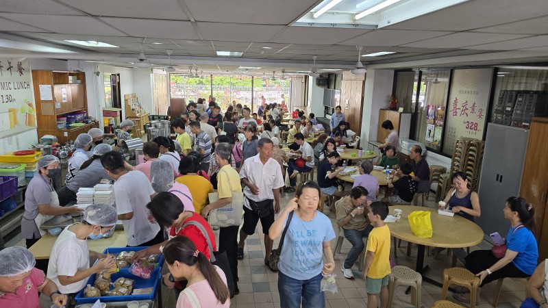 从早上七点半开始,檀香寺食堂便为大众提供了八宝粥和包子作为早餐。与此同时,义工们也开始用心包裹有味饭盒,作为午餐提供给大众。此外,六楼的大雄殿在十点四十五分亦举行了佛前大供。佛前大供环节吸引了许多人来到大雄殿,欢喜参与。