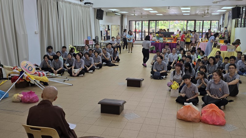 随后,真如师父为大家开示了「浴佛节」的由来和意义,教大家唱诵「佛史之歌」并解释了歌词内容。真如师父开示的同时,维那及悦众等法师们,则前往底楼的福慧灯及三圣殿回向。浴佛法会到此结束。