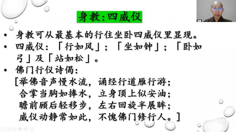 四威仪:「行如风」﹑「坐如钟」﹑「卧如弓」﹑「站如松」。