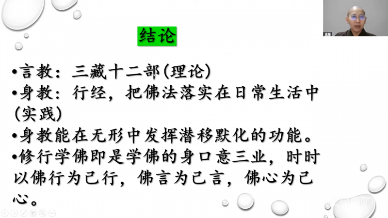 由此可见,佛陀所讲的教法都涵盖在他的言教﹑身教,而且是落实在日常生活中,跟生活息息相关的。我们讲佛法是在日常生活中,是跟我们的身教﹑言教有关系的,没有分开。