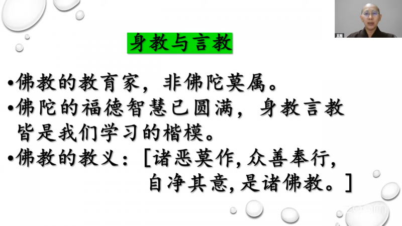 佛陀的福德﹑智慧已圆满,其身教﹑言教皆是我们学习的楷模。佛教的教义: 「诸恶莫作,众善奉行;自净其意,是诸佛教」,佛陀将跟我们说的法﹑教义﹑言教:「诸恶莫作,众善奉行」,全部都落实﹑体现在他的日常生活中。