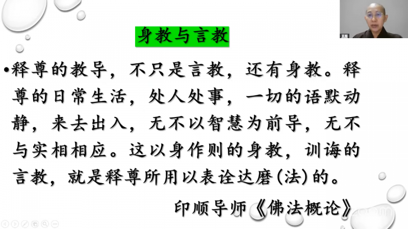 印顺导师在《佛法概论》中提到,「释尊的教导,不只是言教,还有身教。释尊的日常生活,处人处事,一切的语默动静,来去出入,无不以智慧为前导,无不与实相相应。这以身作则的身教,训诲的言教,就是释尊所用以表达磨(法)的。」