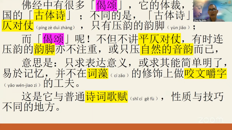 佛经中有很多「偈颂」,它的体裁,好似中国的「古体诗」 ;不同的是,「古体诗」不讲平仄对仗,只有压韵的韵脚;而「偈颂」呢!不但不讲平仄对仗,有时连压韵的韵脚亦不注重,或只压自然的音韵而已,意思是:只求表达意义,或求其能简单明了,易于记忆,并不在词藻的修饰上做咬文嚼字的工夫。这是它与普通诗词歌赋,性质与技巧不同的地方。