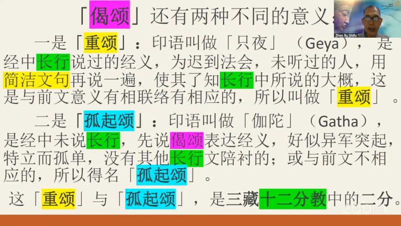 一是「重颂」:印语叫做「只夜」(Geya), 是经中长行说过的经义,为迟到法会,未听过的人,用简洁文句再说一遍,使其了知长行中所说的大概,这是与前文意义有相联络有相应的,所以叫做「重颂」 。
